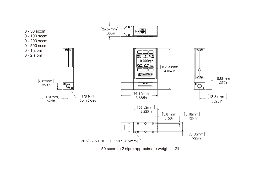 50-500 sccm | 0.07 | 4.07''H x 3.59''W x 1.05''D | 1/8'' NPT 內螺紋 | 1.2lb(約0.5kg) |
