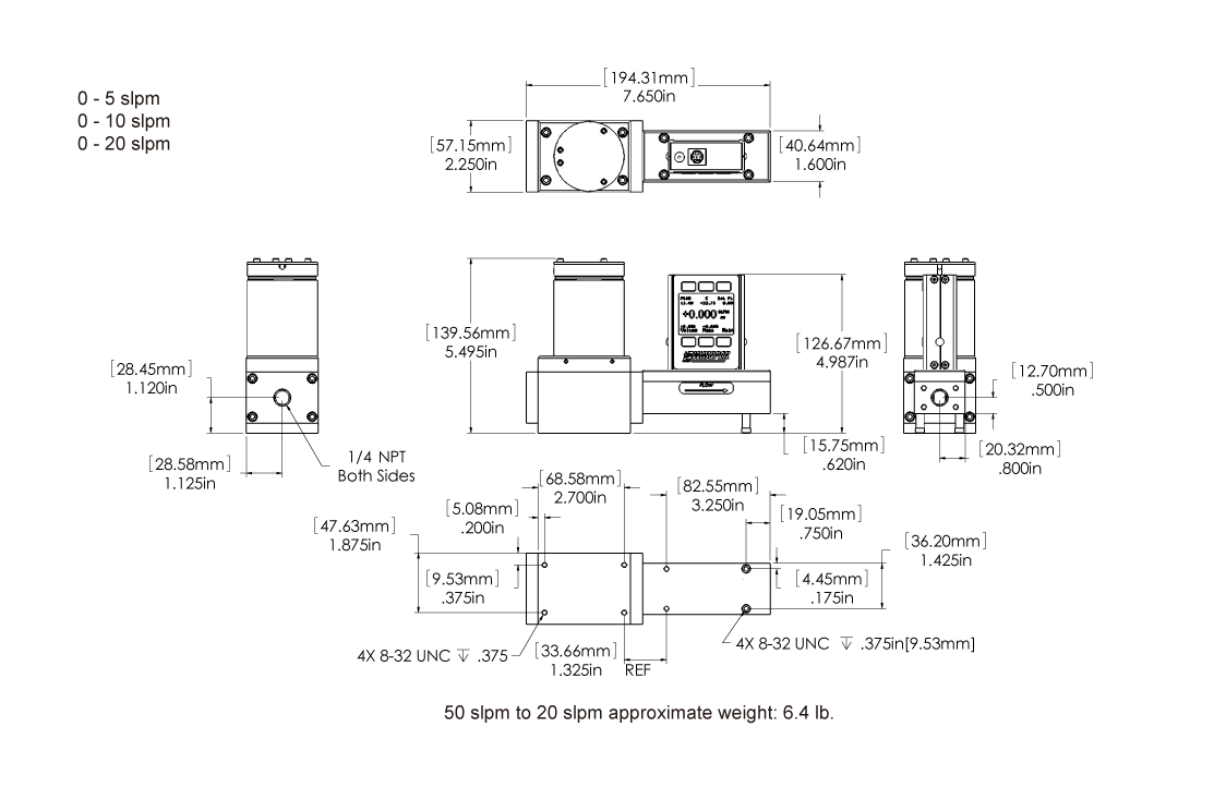 20 slpm(配置R閥門) | 0.26 | 4.37''H x 4.00''W x 1.60''D | ||