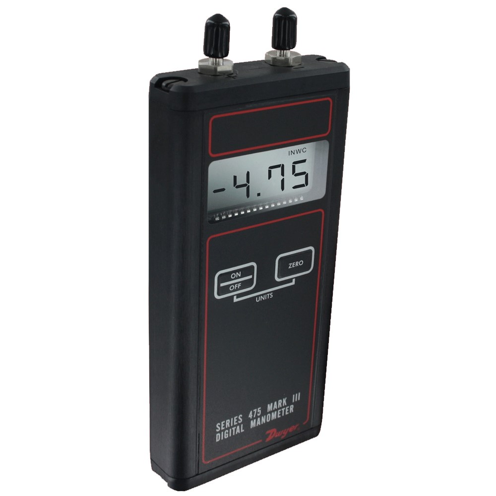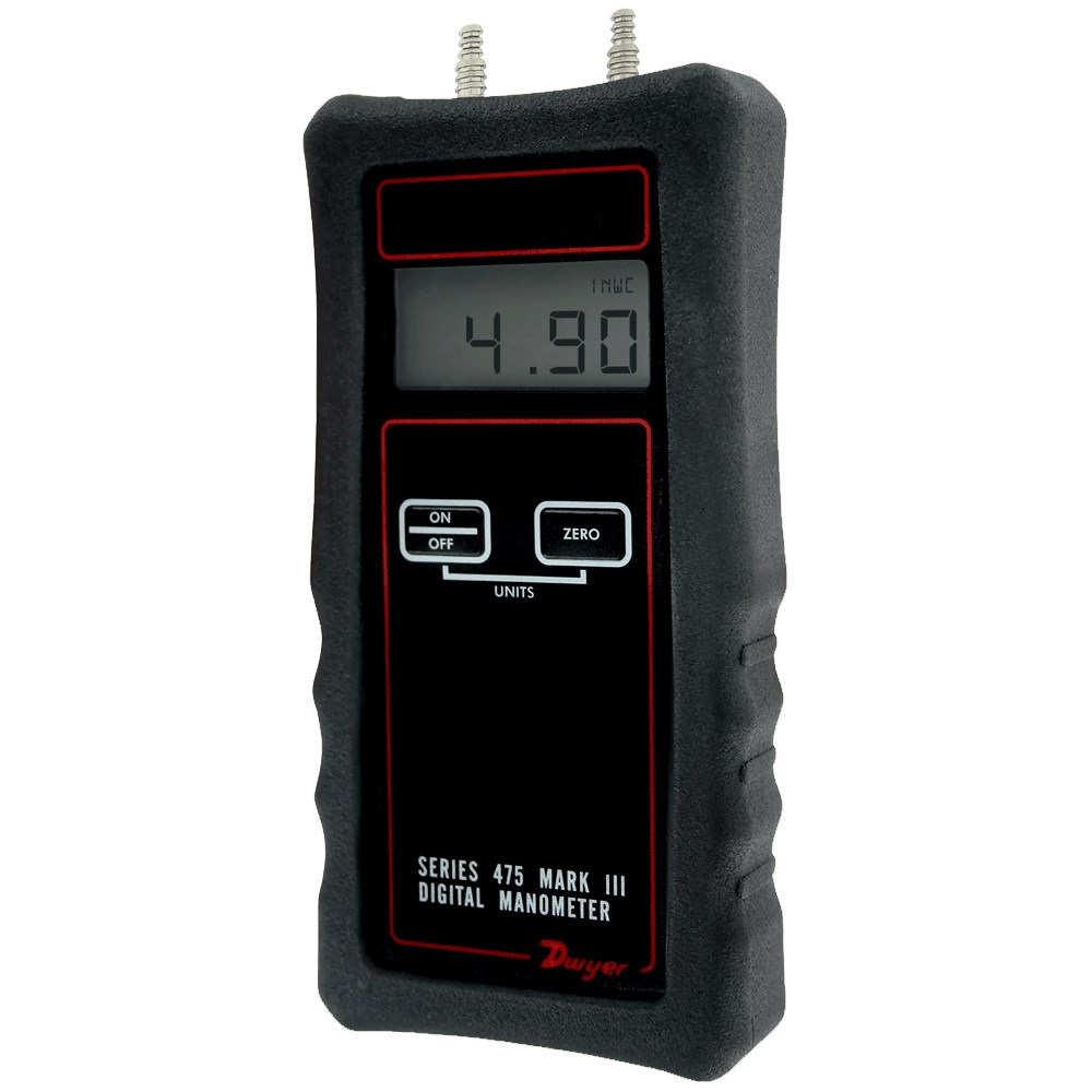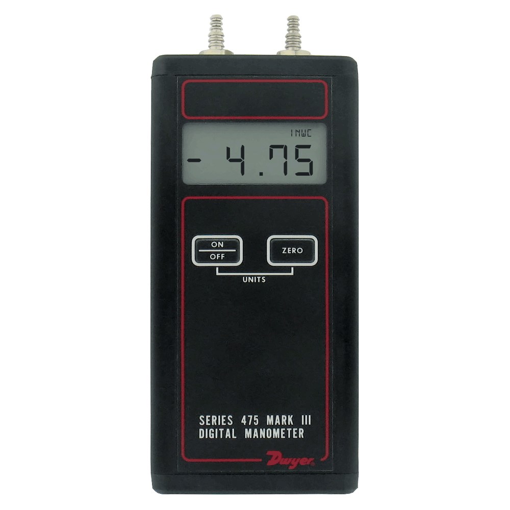 475系列本安型手持式數字壓力計可測量空氣和天然氣的正壓,負壓或差壓,范圍從1 in w.c. (0.249 Kpa)至150psid(10.34 bar)。前面板上的兩個按鍵分別為開關鍵、調零鍵和壓力單元的選擇,兩個鍵同時按可切換公制英制單位,不需再設置或者水平調節,操作簡單和讀數清晰,和Dwyer生產的皮托管配套使用,475手持差壓計可用作風速計。