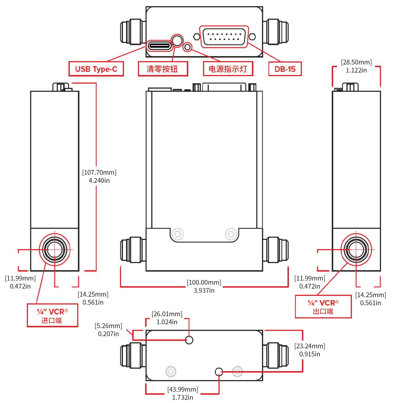 功 耗 | 流量計:1.4 W(58 mA @ 24 VDC)via USB - C 或 DB15 / M12 控制器:4 W(167 mA @ 24 VDC)via DB15 / M12 only |
