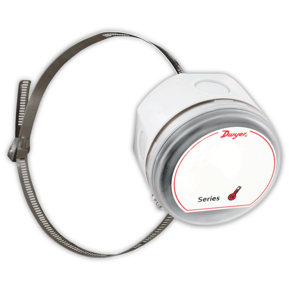 The Series TE-SNW Surface Temperature Sensors non-intrusively measures the process temperature in hot and cold water loops in buildings. An adjustable metal strap can tightly fit around 2 through 6" pipe sizes, allowing the surface area of the copper plate on the sensor to make good contact with the pipe surface. In order to work with most common building controllers, the output of the sensor can be chosen from 6 different RTD and Thermistor curves. Additional features include a quarter turn twist off cap that is chained to the housing to prevent it from getting lost, and multiple knockout locations and sizes to reduce installation time.